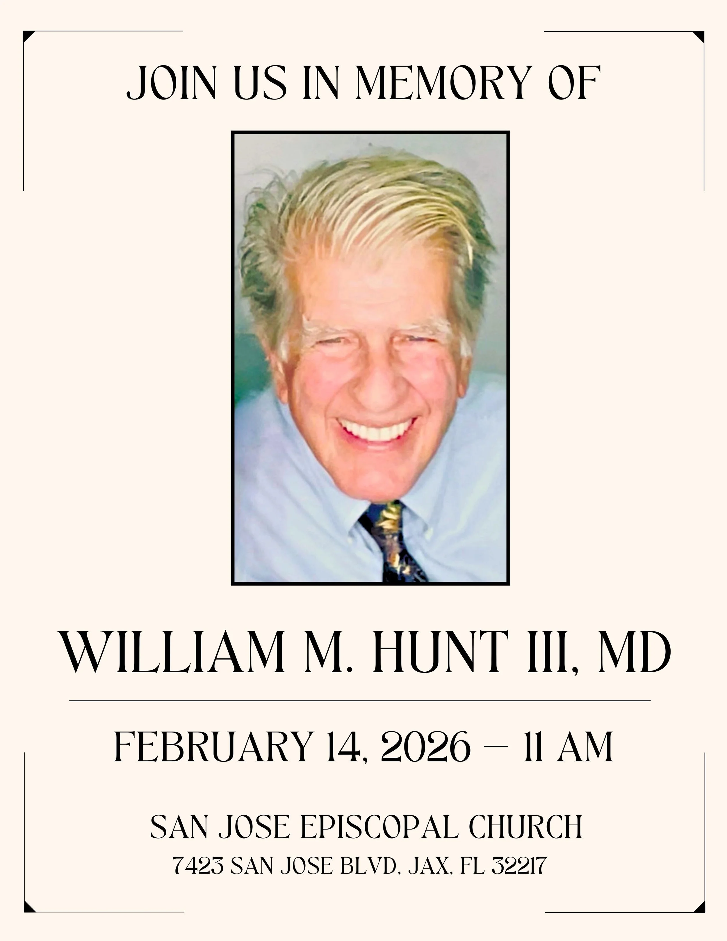 The Service will be held at San Jose Episcopal Church - 7423 San Jose Blvd, Jacksonville, FL 32217